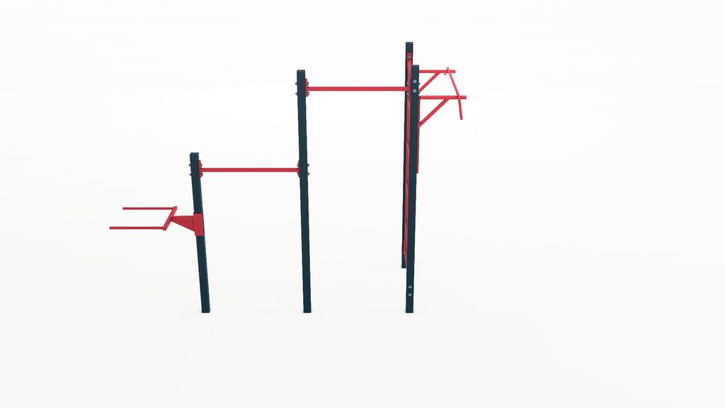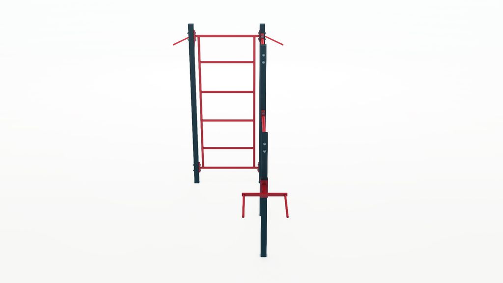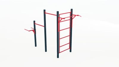 Комплекс состоит из разноуровневых турников для подтягиваний, шведской стенки и брусьев.