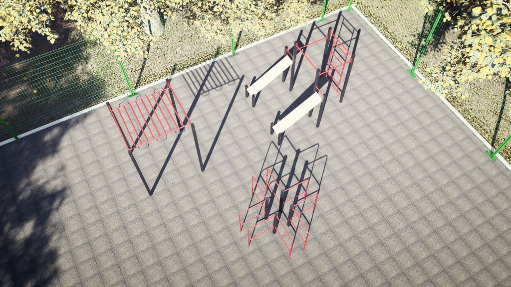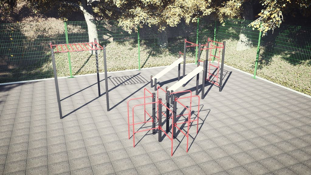 Комплекс состоит из двух лавок для прессса, классического рукохода, комплекса турников, шведской стенки и комплекса брусьев и упоров для отжиманий.